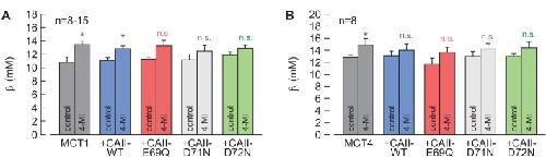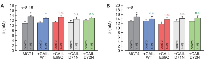 Figure 5—figure supplement 1. Intrinsic buffer capacity of oocytes.(A, B) Intrinsic buffer capacity (βi), as measured by the application of 5% CO2 and 10 mM HCO3–, in oocytes expressing MCT1 (A) or MCT4 (B), either alone or together with CAII-WT, CAII-E69Q, CAII-D71N, and CAII-D72N, in the absence or presence of 4-MI in the cytosol (mean + SEM). *p≤0.05, n.s. no significance; Student’s t-test. |