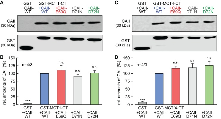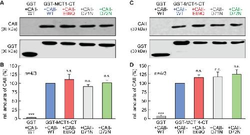 Figure 6. CAII-Glu69 and Asp72 do not mediate binding between MCT1/4 and CAII.(A, C) Representative western blots for CAII (upper panel) and GST (lower panel). CAII-WT, CAII-E69Q, CAII-D71N and CAII-D72N were pulled down with a GST fusion protein of the C-terminal of (A) MCT1 (GST-MCT1-CT) or (C) MCT4 (GST-MCT4-CT). As a negative control, CAII-WT was pulled down with GST alone. (B, D) Relative intensity of the fluorescent signal for CAII (mean +SEM). The signal intensity of CAII, pulled down with GST-MCT1/4-CT was set to 100%. The significance indicators refer to the original values of CAII-WT. ***pâ¤0.001, n.s. no significance; Studentâs t-test.10.7554/eLife.35176.020Figure 6âsource data 1. Original dataset for Figure 6. |