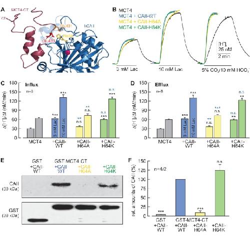 Figure 8. CAII-His64 mediates binding, but no proton transfer, between MCT1 and CAII.(A) Structural model of the binding between the C-terminal tail of MCT1 (purple) and CAII (blue). Binding is mediated by Glu489 (red) and Glu491 (orange) in the MCT1 C-terminal tail and His64 (yellow) in CAII. (B) Original recordings of the change in intracellular H+ concentration in oocytes expressing MCT1 (black trace), MCT1 +CAII-WT (blue trace), MCT1 +CAII-H64A (yellow trace), or MCT1 +CAII-H64K (green trace) during application of 3 and 10 mM of lactate and of 5% CO2 and 10 mM HCO3â. (C, D) Rate of change in intracellular H+ concentration (Î[H+]/Ît) as induced by the application (C) and removal (D) of 3 or 10 mM lactate to oocytes expressing MCT1 (gray), MCT1 +CAII-WT (blue), MCT1 +CAII-H64A (yellow), or MCT1 +CAII-H64K (green) (mean +SEM). The black significance indicators refer to MCT1, the blue significance indicators refer to MCT1 +CAII-WT. (E) Representative western blots for CAII (upper panel) and GST (lower panel). CAII-WT, CAII-H64A, and CAII-H64K were pulled down with a GST fusion protein of the C-terminal of MCT1 (GST-MCT1-CT). As a negative control, CAII-WT was pulled down with GST alone. (F) Relative intensity of the fluorescent signal for CAII (mean +SEM). The signal intensity of CAII pulled down with GST-MCT1-CT was set to 100%. The significance indicators refer to the original values of CAII-WT. ***pâ¤0.001, n.s. no significance, Studentâs t-test.10.7554/eLife.35176.026Figure 8âsource data 1. Original dataset for Figure 8.Figure 8âfigure supplement 1. CAII-His64 mediates binding, but no proton transfer, between MCT4 and CAII.(A) Structural model of the binding between the C-terminal tail of MCT4 (purple) and CAII (blue). Binding is mediated by Glu431 (orange) and Glu433 (red) in the MCT4 C-terminal tail and His64 (yellow) in CAII. (B) Original recordings of the change in intracellular H+ concentration in oocytes expressing MCT4 (black trace), MCT4 + CAII-WT (blue trace), MCT4 + CAII-H64A (yellow trace), and MCT4 + CAII-H64K (green trace) during application of 3 or 10 mM of lactate and of 5% CO2/10 mM HCO3â. (C, D) Rate of change in intracellular H+ concentration (Î[H+]/Ît) as induced by the application (C) and removal (D) of 3 or 10 mM lactate in oocytes expressing MCT4 (gray), MCT4 + CAII-WT (blue), MCT4 + CAII-H64A (yellow) or MCT4 + CAII-H64K (green). The black significance indicators refer to MCT4, the blue significant indicators refer to MCT4 + CAII-WT (mean + SEM). (E) Representative western blots for CAII (upper panel) and GST (lower panel). CAII-WT, CAII-H64A, and CAII-H64K were pulled down with a GST fusion protein of the C-terminal of MCT4 (GST-MCT4-CT). As negative control, CAII-WT was pulled down with GST alone. (F) Relative intensity of the fluorescent signal for CAII (mean + SEM). The signal intensity of CAII pulled down with GST-MCT4-CT was set to 100%. The significance indicators refer to the original values of CAII-WT. ***pâ¤0.001, n.s. no significance; Studentâs t-test. |