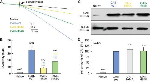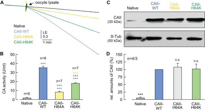 Figure 8âfigure supplement 2. Catalytic activity and expression levels of CAII His64 mutants.(A) Original recording of the log enrichment (LE) of either a lysate of 20 native oocytes (black trace) or a lysate of 20 oocytes expressing CAII-WT (blue), CAII-H64A (yellow), or CAII-H64K (green). The beginning of the traces shows the rate of degradation of the 18O-labelled substrate in the non-catalyzed reaction; the black arrow indicates the addition of the oocyte lysate. (B) Enzymatic activity of CA in units/ml (mean + SEM). The black asterisks refer to the values obtained from native oocytes, the blue significance indicators refer to the values for oocytes expressing CAII-WT, the yellow significance indicators refer to the values for oocytes expressing CAII-H64A. (C) Representative western blot for CAII (upper panel) and β-tubulin (lower panel) from native oocytes and oocytes expressing CAII-WT, CAII-H64A, or CAII-H64K,. (D) Relative intensity of the fluorescent signal for CAII (mean + SEM). The signal intensity of CAII-WT was set to 100%. The significance indicators refer to the original values of CAII-WT. ***pâ¤0.001, n.s. no significance; Studentâs t-test. |