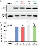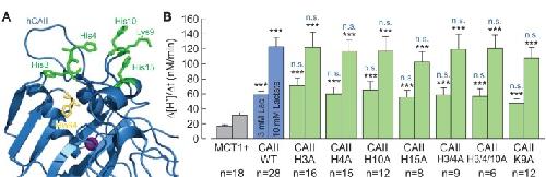 Figure 9. The histidine residues in the N-terminus of CAII are not involved in the interaction between CAII and MCT1.(A) Structural model of human CAII (PDB-ID: 1XEV). His3, His4, His10, Lys9, and His15, which have been suggested to mediate the binding of CAII to various acid/base transporters, are labelled in green. His64, the binding site for MCT1 and MCT4, is labelled in yellow. (B) Rate of change in intracellular H+ concentration (Î[H+]/Ît), as induced by application of 3 or 10 mM lactate, in oocytes expressing MCT1 (dark gray), MCT1 +CAII-WT (blue), or MCT1 +one of the CAII mutants (green) (mean + SEM). The black significance indicators refer to MCT1, the blue significant indicators refer to MCT1 +CAII-WT. ***pâ¤0.001, n.s. no significance; Studentâs t-test.10.7554/eLife.35176.028Figure 9âsource data 1. Original dataset for Figure 9. |