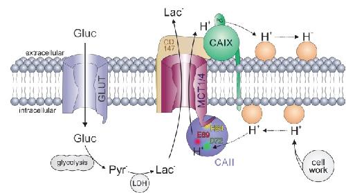 Figure 10. Carbonic anhydrases function as proton antennae for MCTs in glycolytic cancer cells.Intracellular CAII (blue circle) is anchored to the C-terminal tail of MCT1/4 (purple structure) via CAII-His64 (yellow spot). This binding brings CAII close enough to the transporter pore to allow the shuttling of protons between the transporter and the surrounding protonatable residues (orange circles). Proton shuttling is mediated by CAII-Glu69 and CAII-Asp72 (red and green dots). Under hypoxic conditions, CAIX (green circle) binds to MCT1 and MCT4 via their chaperon CD147 (ochre structure) to facilitate the exchange of protons between transporter and extracellular protonatable residues (orange circles) via its proteoglycan-like (PG) domain in a fashion similar to that involving Glu69 and Asp72 in CAII. The necessity for this proton antenna derives from the slow diffusion of H+ within the highly buffered cytosol. Lactate, which is produced from glucose (entering the cell by facilitated diffusion via glucose transporters (light blue structure)) by glycolysis and subsequent conversion of pyruvate, quickly reaches the MCT by simple diffusion. Protons, which are produced during the hydrolysis of ATP, by contrast, diffuse very slowly within the cell. To allow fast extrusion of protons and lactate from the cell, the MCT does not extract H+ directly from the bulk cytosol but rather from an intermediate harvesting compartment made up of protonatable residues in the cell membrane and CAII. As in the cytoplasm, the diffusion of ions in the extracellular space is restricted. Therefore protons have to be removed from the extracellular side of the transporter by CAIX and shuttled to protonatable residues on the extracellular face of the cell membrane, from where they can be released to the extracellular space. By this non-catalytic mechanism, intracellular and extracellular carbonic anhydrases could cooperate non-enzymatically to facilitate proton-driven lactate flux across the cell membrane of cancer cells. |