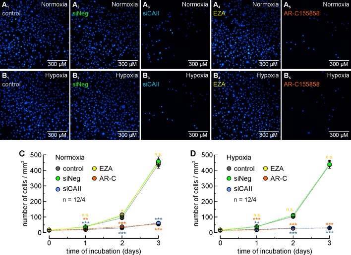 Figure 3. CAII supports proliferation of MCF-7 breast cancer cells.(A, B) Staining of nuclei with Hoechst 33342 (blue) in MCF-7 cells after 3 days in culture under normoxic (A) or hypoxic (B) conditions. Cells were untreated (control; A1, B1), mock-transfected with non-targeting negative control siRNA (siNeg; A2, B2), transfected with siRNA against CAII (siCAII; A3, B3), incubated with 30 µM of the CA inhibitor EZA (A4, B4), or incubated with 300 nM of the MCT1 inhibitor AR-C155858 (A5, B5). (C, D) Total number of nuclei/mm2 in normoxic (C) and hypoxic (D) MCF-7 cell cultures, kept for 0â3 days under the conditions described for (A) and (B). For every data point, four dishes of cells were used and three pictures were taken from each dish at random locations, yielding 12 pictures/data points (n = 12/4). The blue asterisks indicate significance in differences between siCAII and siNeg, the orange asterisks between control and AR-C155858, and the yellow significance indicators between control and EZA. *pâ¤0.05, **pâ¤0.01, ***pâ¤0.001, n.s. no significance; Studentâs t-test.10.7554/eLife.35176.010Figure 3âsource data 1. Original dataset for Figure 3. |