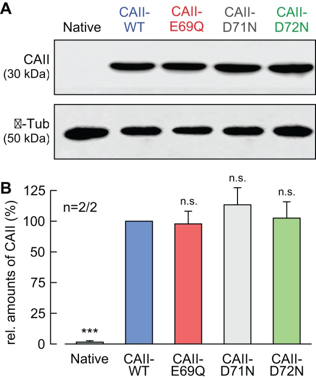 Figure 4âfigure supplement 2. Expression levels of CAII are not altered by single-site mutation.(A) Representative western blots for CAII (upper panel) and β-tubulin (lower panel) from native oocytes and from oocytes expressing CAII-WT, CAII-E69Q, CAII-D71N, and CAII-D72N. (B) Relative intensity of the fluorescent signal for CAII (mean + SEM). The signal intensity of CAII-WT was set to 100%. The significance indicators refer to the original values of CAII-WT. ***pâ¤0.001, n.s. no significance; Studentâs t-test. |