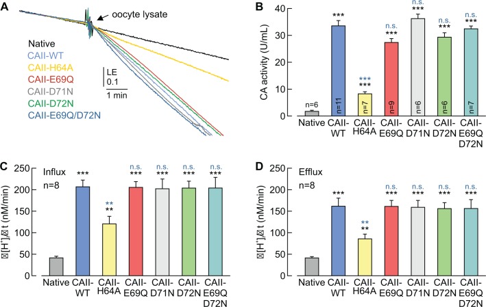 Figure 7. CAII-Glu69 and Asp72 do not support CAII catalytic activity.(A) Original recording of the log enrichment (LE) of either a lysate of 20 native oocytes (black trace) or a lysate of 20 oocytes expressing CAII-WT (blue), CAII-H64A (yellow), CAII-E69Q (red), CAII-D71N (gray), CAII-D72N (green), or the double mutant CAII-E69Q/D72N (turquoise). The beginning of the traces shows the rate of degradation of the 18O-labelled substrate in the non-catalyzed reaction; the black arrow indicates the addition of oocyte lysate. (B) Enzymatic activity of CA in units/ml (mean +SEM). The black asterisks refer to the values from native oocytes, the blue significance indicators refer to the values of oocytes expressing CAII-WT. (C, D) Rate of change in intracellular H+ concentration (Î[H+]/Ît) as induced by the application (C) and removal (D) of 5% CO2/10 mM HCO3â to/from native oocytes and oocytes expressing CAII-WT, CAII-H64A, CAII-E69Q, CAII-D71N, CAII-D72N or the double mutant CAII-E69Q/D72N (mean +SEM). **pâ¤0.01, ***pâ¤0.001, n.s. no significance; Studentâs t-test.10.7554/eLife.35176.022Figure 7âsource data 1. Original dataset for Figure 7. |