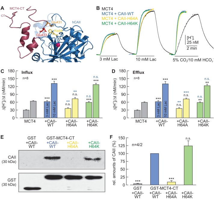 Figure 8—figure supplement 1. CAII-His64 mediates binding, but no proton transfer, between MCT4 and CAII.(A) Structural model of the binding between the C-terminal tail of MCT4 (purple) and CAII (blue). Binding is mediated by Glu431 (orange) and Glu433 (red) in the MCT4 C-terminal tail and His64 (yellow) in CAII. (B) Original recordings of the change in intracellular H+ concentration in oocytes expressing MCT4 (black trace), MCT4 + CAII-WT (blue trace), MCT4 + CAII-H64A (yellow trace), and MCT4 + CAII-H64K (green trace) during application of 3 or 10 mM of lactate and of 5% CO2/10 mM HCO3–. (C, D) Rate of change in intracellular H+ concentration (Δ[H+]/Δt) as induced by the application (C) and removal (D) of 3 or 10 mM lactate in oocytes expressing MCT4 (gray), MCT4 + CAII-WT (blue), MCT4 + CAII-H64A (yellow) or MCT4 + CAII-H64K (green). The black significance indicators refer to MCT4, the blue significant indicators refer to MCT4 + CAII-WT (mean + SEM). (E) Representative western blots for CAII (upper panel) and GST (lower panel). CAII-WT, CAII-H64A, and CAII-H64K were pulled down with a GST fusion protein of the C-terminal of MCT4 (GST-MCT4-CT). As negative control, CAII-WT was pulled down with GST alone. (F) Relative intensity of the fluorescent signal for CAII (mean + SEM). The signal intensity of CAII pulled down with GST-MCT4-CT was set to 100%. The significance indicators refer to the original values of CAII-WT. ***p≤0.001, n.s. no significance; Student’s t-test. |
