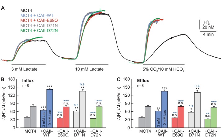 Figure 4—figure supplement 1. CAII-Glu69 and Asp72 are crucial for the facilitation of MCT4 transport activity.(A) Original recordings of the change in intracellular H+ concentration in oocytes expressing MCT4 (black trace), MCT4 + CAII-WT (blue trace), MCT4 + CAII-E69Q (red trace), MCT4 + CAII-D71N (gray trace), and MCT4 + CAII-D72N (green trace), during the application of 3 and 10 mM lactate and of 5% CO2 and10 mM HCO3–. (B, C) Rate of change in intracellular H+ concentration (Δ[H+]/Δt) as induced by the application (B) and the removal (C) of 3 and 10 mM lactate, respectively, in oocytes expressing MCT4 (dark gray), MCT4 + CAII-WT (blue), MCT4 + CAII-E69Q (red), MCT4 + CAII-D71N (light gray), and MCT4 + CAII-D72N (green) (mean + SEM). The black significance indicators refer to MCT4, the blue significant indicators refer to MCT4 + CAII-WT. *p≤0.05, p≤0.01, ***p≤0.001. n.s. no significance; Student’s t-test. |