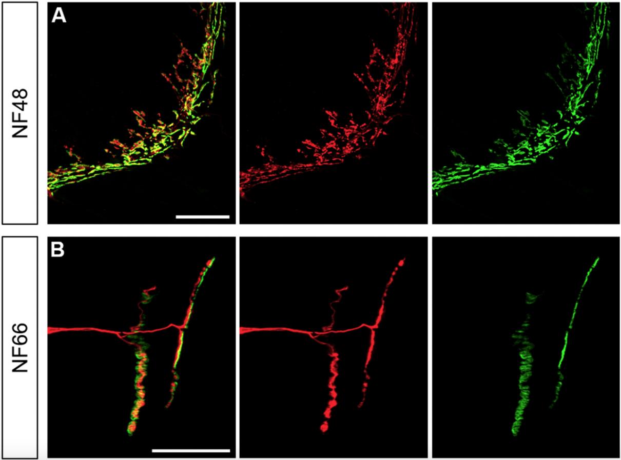 Whole mounted X. tropicalis NF48 embryos at the medial ventral region (A) and longitudinal sections of Tibialis anterior longus muscles obtained from NF66 post-metamorphic X. laevis froglets (B) were immunostained to reveal neurons (3A10 plus SV2 antibodies, red) and AChR aggregates (BTX staining, green), and subsequently imaged by confocal microscopy. Scale bars: 50â¯Î¼m (A); 30â¯Î¼m (B). |