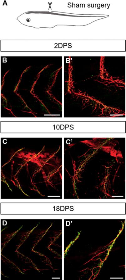 (A) Scheme of the sham operation procedure in NF50 X. laevis embryos, where only the skin and the superficial muscle tissues were injured. (B-D) Sham tadpoles were collected 2 (B), 10 (C) and 18 (D) days post sham (DPS). Embryos were immunostained to label neurons (using 3A10 plus SV2 antibodies, red) along with staining of AChR aggregates with BTX (green), and subsequently imaged by confocal microscopy. Magnified images of B, C and D are shown in B', C' and D', respectively. Orientation of embryos: anterior (left), posterior (right), dorsal (up), ventral (down). Scale bars: 200â¯Î¼m (B,C,D); 100â¯Î¼m (B',C',D'). |