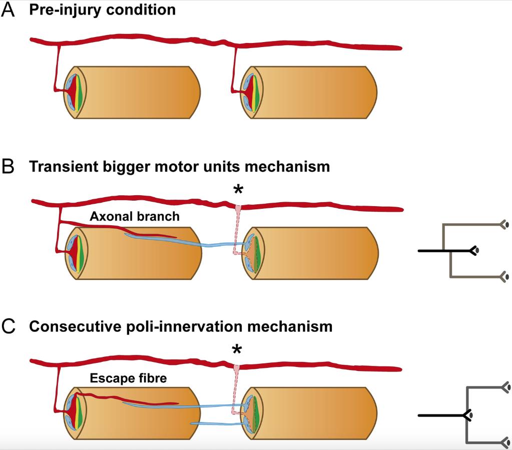 Previous to SCI, motor axons (red) project from the spinal cord to innervate AChR aggregates (green) of myotomal muscles to form NMJs (yellow) (A). Following SCI (asterisk), motor axons within the lesion site will undergo Wallerian degeneration (red dotted line). After 10DPT, collateral projections from rostral axons migrate towards caudal denervated muscle fibres. We envision two possible mechanisms for these observations. (B) These projections are branches of axons located rostral to the injury site, resulting in the formation of transiently bigger motor units. (C) These projections are âescape fibresâ that protrude from a rostral innervated NMJ to contact caudal denervated postsynaptic domains. In both cases, collateral axons will be guided by projections of terminal Schwann cells (light blue), which protrude from the denervated NMJs. Schemes at the right of B and C represent the origin of the motor axon collaterals (gray lines) from a pre-existing axon (black line). |