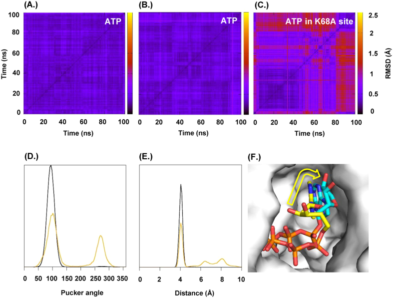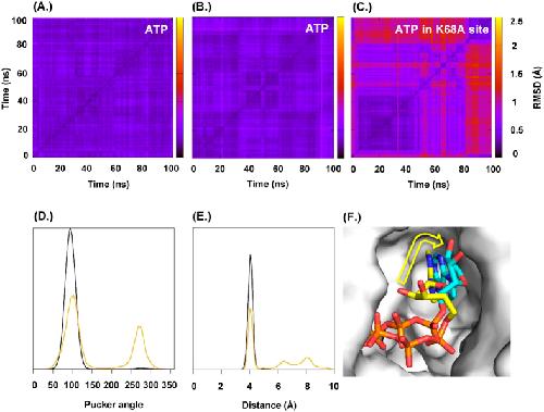 Figure 1. MD simulations of ATP binding at WT subunits and one incorporating the K68A binding site mutation.(AâC) 2-D rmsd plots of ATP in P2X1R wild type and P2X1R (K68A) binding sites. 1000 Snapshots were extracted from the 100âns molecular dynamics trajectories (one snapshot every 10âps) and used to calculate all-against-all rmsd values for ATP. The rmsd value (in à ) for each calculation is indicated by the colour gradient. ATP bound in a wild type P2X1R binding site (left and centre panel) shows very little variation. In contrast ATP bound to a P2X1R K68A binding site (right panel) shows generally more conformational variability. In the trajectory visualised a conformational transition appears after around 80âns. (D) Ribose pucker phase angle frequency for ATP in P2X1R wild type and K68A binding sites. ATP in the wild type site (black) is almost exclusively in the C2â² endo conformation while in the K68A binding site (orange) Câ²3 endo conformations are also present (peak at ~270 degree). Values are reported according to the Cremer convention. (E) Distance between the gamma phosphate phosphor atom and the Câ²2 of the ribose. Plotted are the relative frequencies of γ-P â Câ²2 distances for ATP in a wild type P2X1R binding site (black) and ATP bound to a P2X1R K68A binding site (orange). ATP in the wild type binding site remains in the U shaped conformation, while in K68A binding site additional conformations are accessible indicated by the peaks at ~6.5âà and ~8âà . (F) Binding conformations for ATP are shown for two snapshots before and after the conformational transition in an overlay corresponding to trajectories at 0.8âns and 6.8âns in the right panel of (C).