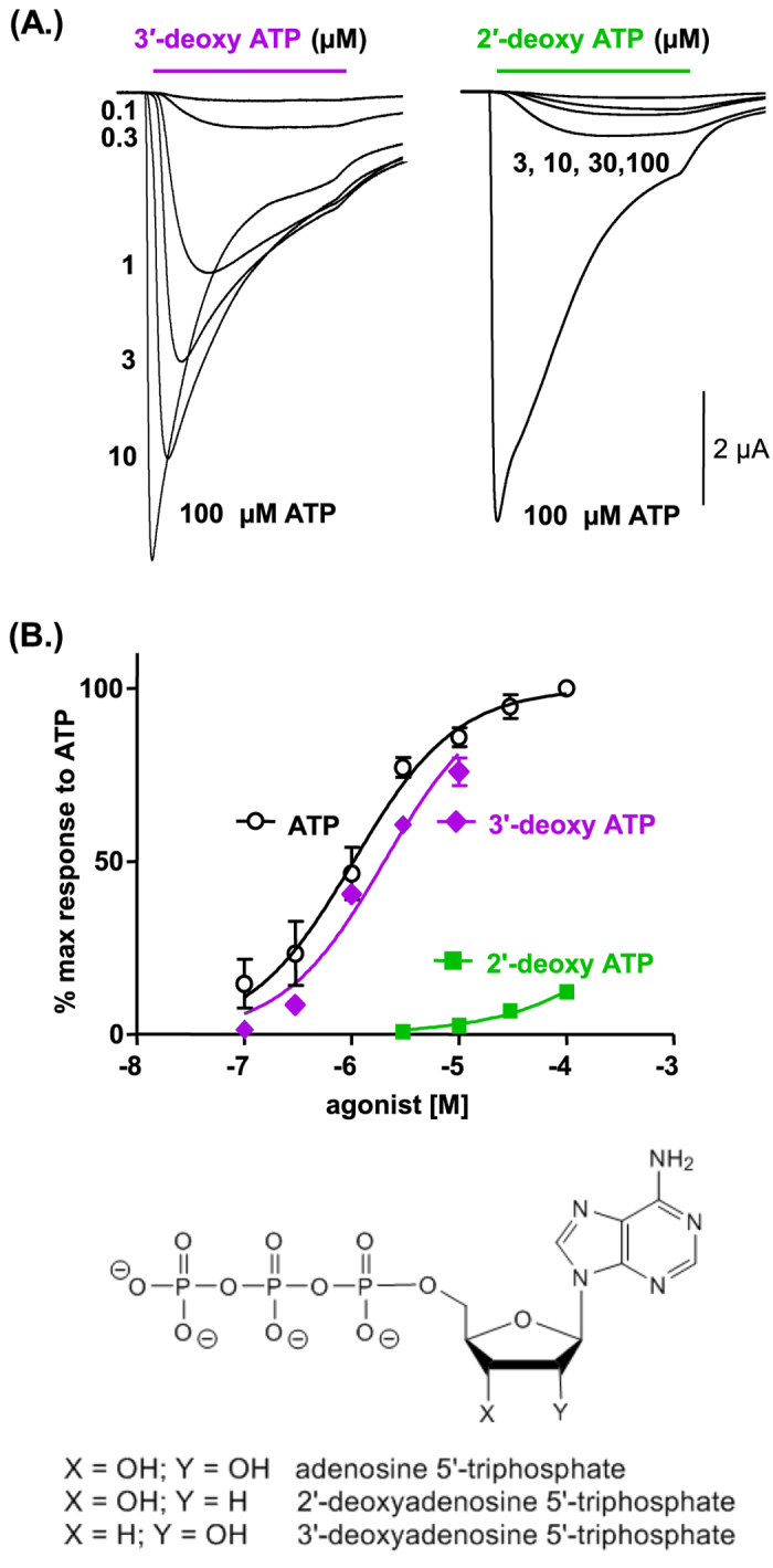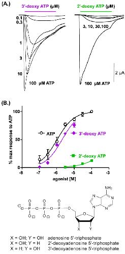 Figure 3. The hydroxyl group at the 2â², but not 3â², position on the ribose ring of ATP is important for agonist action at P2X1Rs.(A) Agonist evoked currents (3âs application indicated by bar) at P2X1Rs. Representative traces from a single oocyte are shown for 3â²-deoxy ATP and 2â²-deoxy ATP (a response to a maximal concentration of ATP 100âμM from the same oocyte is shown for comparison). (B) Concentration response curves for agonist evoked currents, ATP (open circles), 3â²-deoxy ATP (purple diamonds) and 2â²-deoxy ATP (green squares). Due to cost a maximal concentration of 10âμM 3â²-deoxy ATP was used. Data are shown as meanâ±âSEM, nâ=â4.