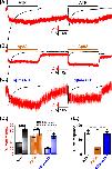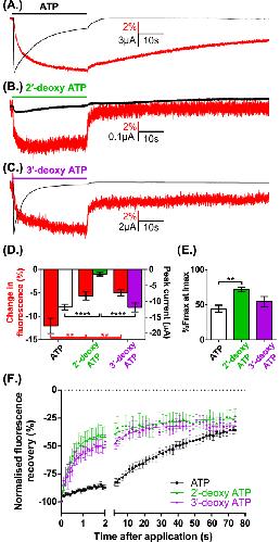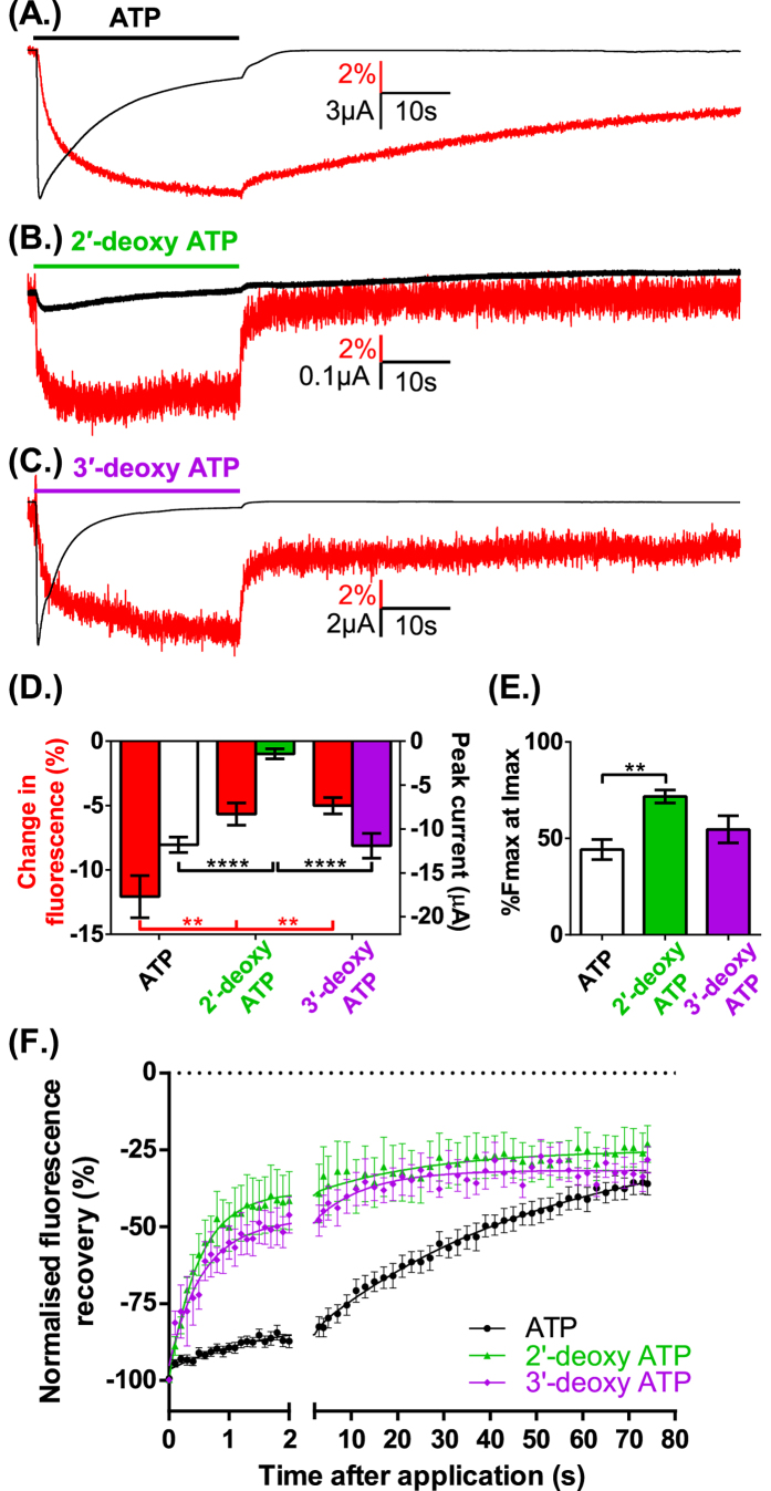 Figure 4. VCF reports changes in fluorescence induced by deoxyadenosine 5′-triphosphates.(A) Example of VCF traces from oocytes expressing P2X1R K190C (10 μM ATP indicated by bar, black trace = current recording, red trace = fluorescence). Inward currents and decreases in fluorescence were also seen with the application of (B) 2′-deoxy ATP and (C) 3′-deoxy ATP (both 10 μM). The fluorescence changes were significantly smaller than those seen with ATP while 2′-deoxy ATP evoked a significantly reduced current (D) The proportion of the fluorescence change at peak current (%Fmax at Imax, (E)) was also significantly greater that ATP with the application of 2′-deoxyATP. (F) The recovery of the fluorescence change following agonist wash out was significantly faster for both 2′-dATP and 3′-deoxy ATP compared to ATP, with time from 90% to 50% fluorescence recovery of 1.0 ± 0.5 s, 2.5 ± 0.9 s and 30.4 ± 2.0s respectively. Data are shown as mean ± SEM, n ≥ 5, **p < 0.01, ****p < 0.0001.