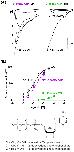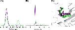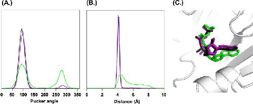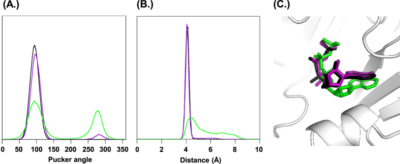 Figure 5. Conformations of ATP, 3′-deoxy ATP and 2′-deoxy ATP in the P2X1R binding site.(A,B) Nucleotide conformations in the MD simulations extracted from a total of six traces (three binding sites, two replicates) are monitored via their ribose pucker phase angle (A) and the distance between the gamma phosphate phosphor atom and the C′2 of the ribose (B) Plotted are the relative frequencies of the respective angle (3.6 degrees window) and distance (0.1 Å window) for ATP (black), 3′deoxy-ATP (purple) and 2′-deoxy-ATP (green). The second peak in the ribose pucker phase angle distribution and the broad shoulder in the distribution of 2′-deoxy ATP γ–phosphate C′2-ribose distances indicates at least two conformational states. (C) Overlay of ATP (black), 3′-deoxy-ATP (purple), and the non U shaped 2′-deoxy ATP (green) conformation, the P2X1R is shown as a cartoon, the nucleotides are shown as stick models.