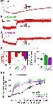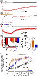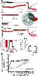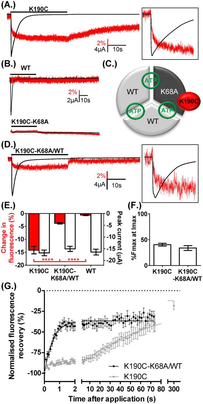 Figure 2. Fluorescence changes can be rescued in ATP insensitive subunits by co-expression of WT subunits.(A) Example VCF traces from K190C showing rapidly desensitizing current and decrease in fluorescence with ATP (100 μM). Insert shows expanded timescale during initial ATP application, with fluorescence change normalized to peak current. (B) Example of VCF traces from oocytes expressing wild type hP2X1R (upper panel) and double mutant P2X1R K190C-K68A (lower panel). Both show no change on fluorescence with 100 μM ATP application (30 s indicated by bar) and no current was evoked from K190C-K68A. (C) Schematic showing a heteromeric receptor with two WT and one K190C-K68A mutant subunit (grey), inter-subunit binding sites are shown in green and labelling of the mutant subunit by cysteine reactive MTS-TAMRA (in red). (D) The ATP evoked current and fluorescence changes were recovered by co-expressing K190C-K68A with WT P2X1R, although the fluorescence change was significantly smaller than those seen for K190C. Insert shows expanded timescale during initial ATP application, with fluorescence change normalized to peak current. (E). There was no difference in the %Fmax at Imax between K190C and K190C-K68A/WT (F). (G) The recovery of the fluorescence change following agonist wash out was significantly faster for K190C-K68A/WT compared to K190C (traces normalized to peak decrease in fluorescence), with time from 90% to 50% fluorescence recovery of 0.7 ± 0.3 s and 38.8 ± 4.7 s respectively. Data are shown as mean ± SEM, n ≥ 6, ****p < 0.0001.