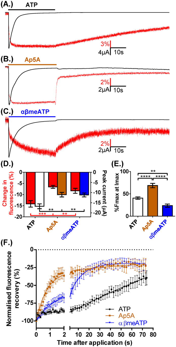 Figure 6. VCF profile is ATP analogue dependent.(A) Example of VCF traces from oocytes expressing P2X1R K190C (100 μM ATP indicated by bar). Inward currents and decreases in fluorescence were seen with the application of (B) Ap5A and (C) αβmeATP (100 μM). The fluorescence changes induced by αβmeATP were significantly smaller than those seen with ATP while both Ap5A and αβmeATP generated significantly reduced currents (D). The proportion of the fluorescence change at peak current (%Fmax at Imax, (E)) was significantly greater with the application of Ap5A while significantly reduced with αβmeATP application. (F) The recovery of the fluorescence change following agonist wash out was significantly faster for both Ap5A and αβmeATP compared to ATP, with time from 90% to 50% fluorescence recovery of 1.4 ± 0.4 s, 6.5 ± 1.4 s and 38.8 ± 4.7 s respectively. Data are shown as mean ± SEM, n ≥ 4, *p < 0.05, **p < 0.01, ****p < 0.0001.