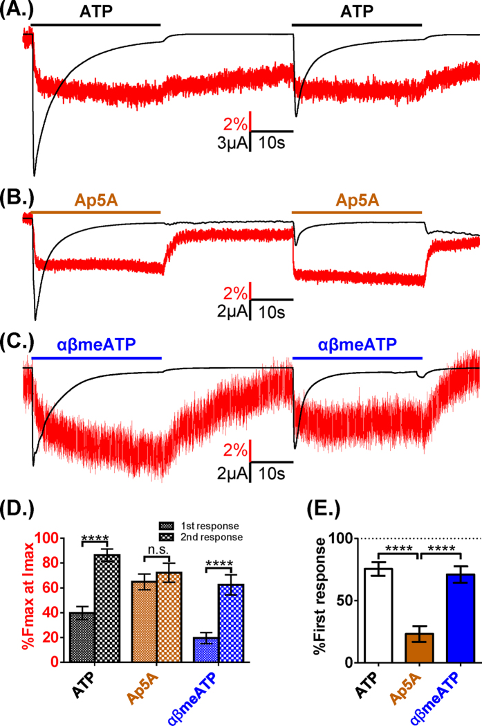 Figure 7. Differential recovery of fluorescence and channel activity from activation by ATP analogues.(A) Example of VCF traces from oocytes expressing P2X1R K190C to two 30 second ATP applications (100 μM indicated by bar) with 30 second washout between. A sustained fluorescence decrease was observed during the first agonist application that partially recovered with washout. The subsequent application induced a smaller peak current with a decrease in fluorescence to a similar level as previous. (B) Replacing ATP with Ap5A (100 μM) in the above protocol generated an attenuated current during the second application with a similar decrease in fluorescence as the initial application. The response seen with αβmeATP (C) was similar to that seen with ATP. Measuring the average %Fmax at Imax during the first and second applications (D) showed no change in the proportion of the fluorescence change with application of Ap5A, while both ATP and αβmeATP showed more rapid change in fluorescence with the subsequent agonist trial. (E) Graph showing the average evoked current during the second agonist application as a percentage of the first, with Ap5A showing a significantly reduced current compared to ATP or αβmeATP. Data are shown as mean ± SEM, n ≥ 3, ****p < 0.0001.