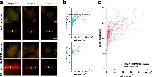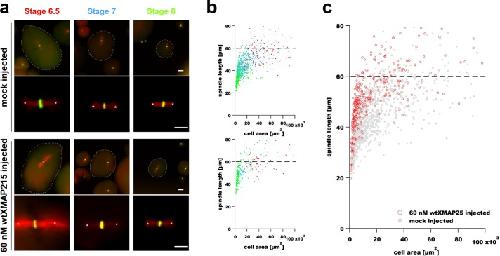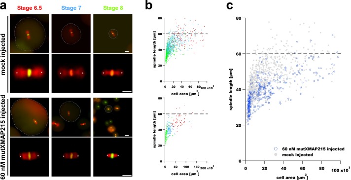 FIGURE 2:. Microinjection of a polymerase-deficient mutant XMAP215 decreases spindle length in early X.laevis embryos. (a) Images show representative spindles in blastomeres isolated from embryos at the indicated stages. The two top rows show spindles in blastomeres from control (mock-injected) embryos, whereas the two bottom rows show spindles from blastomeres isolated from embryos injected with 60 nM mutXMAP215. Spindle MTs and DNA were labeled as in Figure 1. Scale bar = 50 µm (images in first and third rows). Scale bar = 30 µm (higher-magnification spindle images in second and fourth rows). Spindle length was again measured as the aster centerâtoâaster center distance (centers are marked with white asterisks). Cell boundaries, indicated by dashed outlines shown in lower-magnification spindle images, were manually traced and used to determine cell cross-sectional area for scaling plots. (b) Spindle length measurements are shown plotted as a function of blastomere cross-sectional area in mock-injected embryos (top plot) and in embryos injected with 60 nM mutXMAP215 (bottom plot). Data point colors correspond to stage-specific text colors shown above images in panel a. (c) Data from both graphs in b were plotted in a single graph and show a general downward shift in spindle length with the injection of 60 nM mutXMAP215. Dashed horizontal lines indicate the putative upper limit to spindle size in X. laevis embryos (Wuhr et al., 2008).