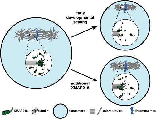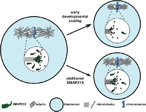 FIGURE 4: Model of XMAP215 regulation of MT end dynamics and spindle scaling during X. laevis development. The cartoon depicts the mechanism of XMAP215-dependent spindle scaling during development. As cell size decreases during early development, the number of XMAP215 molecules in each blastomere is concomitantly reduced, resulting in fewer XMAP215 molecules per MT plus-end, slower MT growth rates and, by mass action, smaller spindles. Additional XMAP215 can compensate for this loss and, because other components are not limiting, allow for the generation of larger-than-expected spindles for a blastomere of a given size.