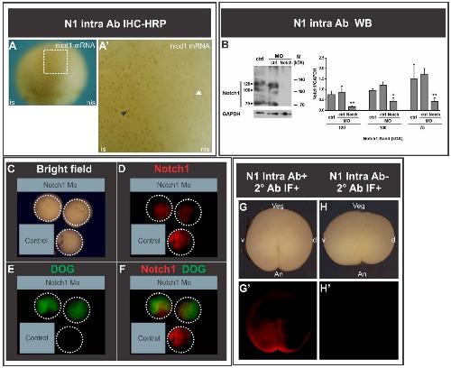 Figure S5. Notch1 intra antibody ab8387 (N1 intra Ab) specifically recognizes Notch1 protein in Xenopus laevis embryos. (A,Aâ) Embryo unilaterally injected with 1 ng of Xenopus laevis nicd1 mRNA into 1 cell at the 2-cells stage, fixed at gastrula stage and processed for immunohistochemistry with a horseradish peroxidase-conjugated secondary antibody (IHC-HRP). (Aâ) Higher magnification view of the area indicated by the dashed box in A. Diaminobenzidine brown development clearly showed a very strong and dense nuclear staining (black arrow) on the injected side (is), confirming that N1 intra Ab recognizes Xenopus laevis NICD1 when overexpressed. The non-injected side (nis) showed a lighter staining in scattered nuclei (white arrow), indicating that N1 intra Ab could also detect the endogenous NICD1. (B) Western blot (WB) analysis of protein extracts obtained at s15 from uninjected controls (ctrl), embryos injected with 80 ng of Control Mo (ctrl MO) or with 80 ng of Notch1 Mo (Notch MO) at the 1-cell stage. The N1 intra Ab recognizes bands corresponding to Notch1 normal processing (Kopan and Ilagan, 2009) in extracts from uninjected controls and from Control MO-injected embryos: one around 120 kDa, which is expected to correspond to the Notch1 fragments containing the transmembrane domain (Notch transmembrane and intracellular domain, NTMIC; Notch extracellular truncation, NEXT) and a band of around 100 kDa, which is expected to correspond to NICD (Notch intracellular domain), as has been previously shown with other antibodies recognizing Notch1 in cell and embryo extracts from mammals (Zagouras et al., 1995) (Blaumueller et al., 1997) (De Falco et al., 2015). A lower molecular weight band of 75 kDa was also observed at this stage. The three bands are specific, since they were significantly reduced by Notch1 Mo (* P< 0.05, ** P< 0.01, One Way ANOVA test). Results are shown as the mean+s.e.m. of three independent experiments. (C-F) N1 intra Ab IF (D,F, red channel) in animal hemispheres from s6 embryos that were injected at s1 with 60 ng of Notch1 Mo + DOG as tracer (upper embryos) and from a sibling uninjected control (lower embryo), photographed together. (C) Bright field image. (E, F) Green fluorescence from the tracer. Notch1 Mo decreased N1 intra Ab IF in all injected embryos (n=10), confirming that N1 intra Ab specifically recognizes Notch1 protein in Xenopus embryos. (G-Hâ) Internal views of left halves of 4- cells embryos processed for IF with anti-rabbit IgG-Alexa 594 as secondary antibody (2° Ab), with (G,Gâ) or without (H,Hâ) N1 intra Ab primary antibody. (G,H) Bright field. (G´,Hâ) Fluorescence image, red channel, of the same embryos shown in G,H, respectively. The secondary antibody did not show non-specific fluorescence. d, dorsal; v, ventral; An, animal; Veg, vegetal. |