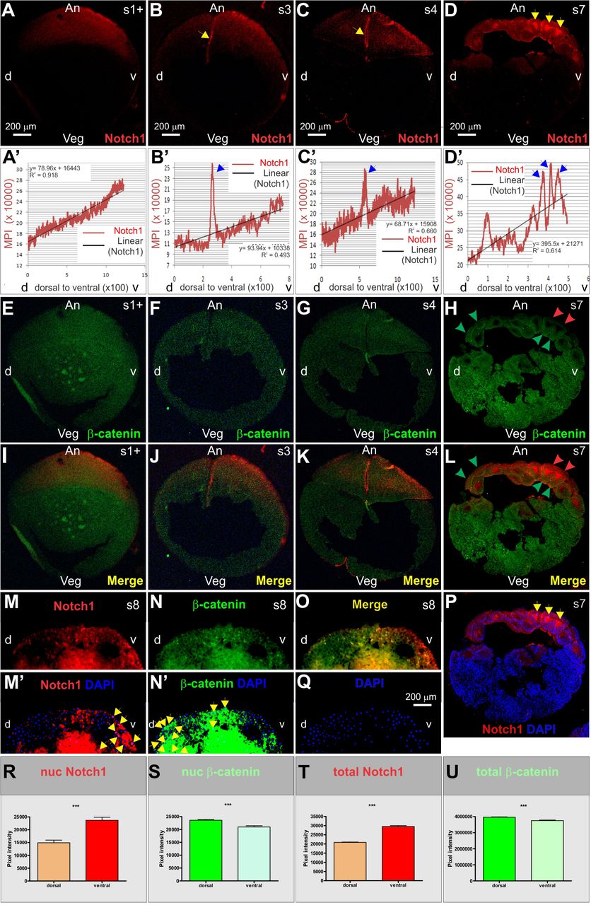 Fig. 1. Distribution of endogenous Notch1 and β-catenin proteins from s1 to mid-blastula in cryostat sections of Xenopus embryos. Left halves of embryos were collected at the indicated stages and were then cut into 20â µm cryostat sections. The embryonic early axes were predicted according to the original pigmentation. (A-D) Notch1 IF was significantly higher in the ventral than in the dorsal region. This was confirmed by comparing vROI with dROI quantifications (P<0.0001, not shown). (Aâ²-Dâ²) Quantification of Notch1 IF of the embryos shown in A-D, respectively. Mean pixel intensity (MPI, y-axis) in a rectangular animal ROI was plotted (red line) in relation to the position in the DV axis (x-axis). The black line shows a linear estimate by linear regression analysis (parameters shown in inset): a positive slope indicates the increase of Notch1 IF from dorsal to ventral. The yellow arrows in B and C show Notch1 IF in the cell membranes between the animal dorsal and animal ventral blastomeres at s3 and s4, which correlate with the high peaks indicated with the blue arrows in Bâ² and Câ², respectively. Note the ventral nuclei with highest Notch1 signal (D,P, yellow arrows), which correlate with the highest peaks in the profile in this s7 embryo (Dâ², blue arrows). (E-H) Total β-catenin IF from s1+ to s7. Although the IF in the images was low and noisy at the earliest stages (most evident in F,G), quantification in dROIs and vROIs in E-H (not shown) revealed that it was significantly higher in the ventral region in E (P<0.0001) and in G (P=0.0006), while there was no significant difference between the dorsal and the ventral regions in F (P=0.11). In the embryo shown at s7 (H), total β-catenin IF was significantly higher in the dorsal ROI (P<0.0001). (I-L) Merged images of Notch1 and β-catenin IF. Note the lower total β-catenin IF in the apical region of the ventral cells, which instead show high Notch1 IF (H,L, red arrows). Total β-catenin IF appears higher in the basal region of these cells and more uniform in the dorsal cells (H,L, green arrows) (see Fig. S4 for another example). (M-Q) Notch1 IF (M) and β-catenin IF (N) in an s8 embryo. (Mâ²,Nâ²) Highly contrasted images of M and N, respectively, merged with the DAPI nuclear image (Q) to facilitate visualization of Notch1+ nuclei on the ventral side (Mâ², yellow arrows) and β-catenin+ nuclei in the dorsal side (Nâ², yellow arrows). (O) Merged image of M and N, showing highest levels of Notch1 IF in the ventral side and highest levels of total β-catenin IF in the dorsal side in this s8 embryo. (P) Merged DAPI and Notch1 IF of s7 embryo. (R) Notch1 IF in the nuclear region was significantly higher in the ventral side. (S) β-Catenin IF in the nuclear region was significantly higher in the dorsal side. (T,U) Quantification of total Notch1 (T) and total β-catenin (U) in dorsal and ventral ROIs of the images shown in M and N, respectively. The ventral region expresses significantly higher levels of Notch1 protein than the dorsal region; in contrast, the dorsal region expresses significantly higher levels of β-catenin protein than the ventral region. Data are mean+s.e.m. ***P<0.0001 (double-tailed MannâWhitney test). An, animal; d, dorsal; s, stage; v, ventral; Veg, vegetal. |