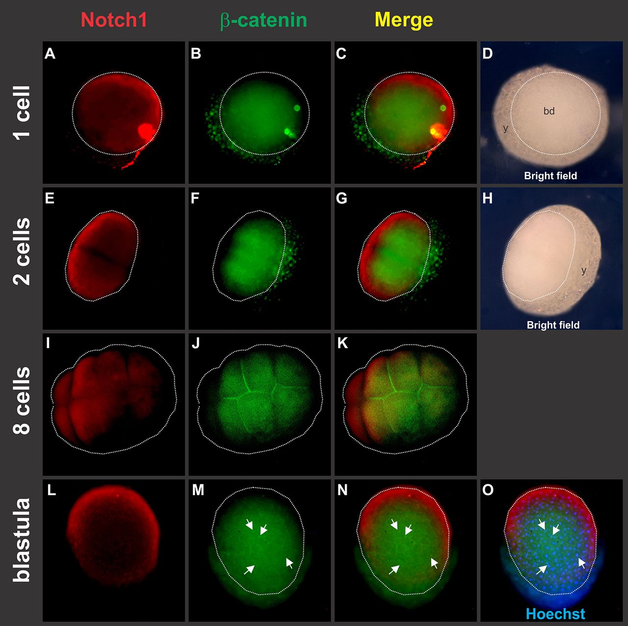 Fig. 3. Distribution of endogenous Notch 1 and β-catenin proteins in zebrafish embryos. (A-O) Animal views of zebrafish embryos at the indicated stages (Kimmel et al., 1995) showing Notch1 IF (A,E,I,L), total β-catenin IF (B,F,J,M) and merged images of Notch1 and total β-catenin IF (C,G,K,N). D and H show bright-field views of the one-cell and two-cell stages, respectively, indicating the blastodisc (bd, demarcated by the dotted white line) and yolk cell (y). (O) Merged image of nuclear Hoechst (blue) with Notch1 and total β-catenin IF. White arrows point to nuclear β-catenin in M-O. |