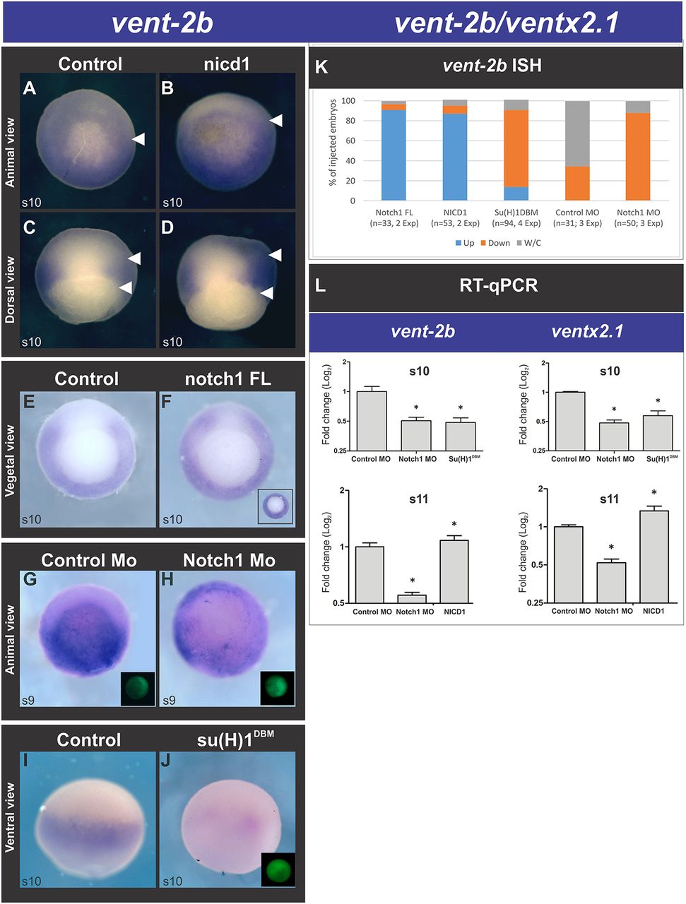 Fig. 5. Notch1 is necessary for the expression of ventral center genes of the Ventx family. (A-J) ISH expression pattern of vent-2b mRNA in embryos in which the Notch pathway was stimulated (B,D,F) or blocked (H,J), and in their corresponding sibling uninjected controls (A,C,E,I) or control Mo-injected sibling (G). Insets show the green fluorescence of the co-injected tracer DOG. (B,D) Embryos injected with 1â ng of nicd1 mRNA when the first cleavage was incipient. Note the expansion of vent-2b expression in comparison with the uninjected sibling controls (A,C), indicated by arrowheads. (F) Embryo injected with 1â ng of notch1 FL mRNA at the one-cell stage. The expression of vent-2b was expanded towards the dorsal side in most embryos (95%, n=19) in comparison with uninjected sibling controls (E), occasionally occupying completely the dorsal region, as shown in inset (10% of the injected embryos). (G,H) Sibling embryos unilaterally injected with 30â ng of control Mo (G) or with 30â ng of Notch1 Mo (H) when the first cleavage was incipient. Note the downregulation of vent-2b towards the injected side. (J) Embryo injected with 4â ng of su(H)1DBM mRNA at the one-cell stage. The expression of vent-2b was consistently weaker than in uninjected sibling controls (I). (K) Summary of ISH results, expressed as the percentage of embryos for the changes in vent-2b expression, indicated by the color codes [cyan, upregulated; orange, downregulated; gray, without changes (W/C)]. The number of total embryos analyzed (n) and the number of independent experiments (Exp) are indicated for each bar. (L) Quantification of vent-2b (left) and ventx2.1 (right) mRNAs by RT-qPCR at s10 and s11. Data are mean+s.e.m. *P<0.05 (one-way ANOVA analysis compared with control Mo injection). s, stage. |