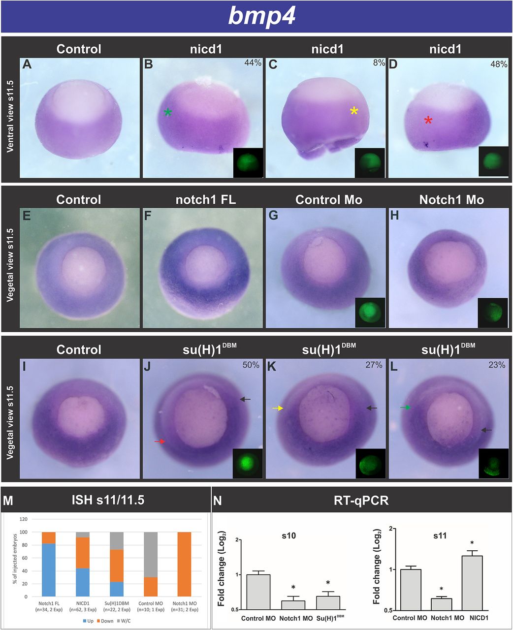 Fig. 6. Effects of manipulating Notch1 activity on the ventral center gene bmp4. (A-L) ISH expression pattern of bmp4 in embryos in which the Notch pathway was stimulated (B-D,F) or blocked (H,J-L). Corresponding sibling uninjected controls (A,E,I) or control Mo-injected sibling (G). Insets show the green fluorescence of the co-injected tracer DOG. (B-D) Embryos unilaterally injected with 1â ng of nicd1 mRNA into one cell at the two-cell stage. Bmp4 was upregulated on the injected side in comparison with the non-injected side in some cases (B, 44%, n=62; green asterisk), but it was downregulated in others (D, 48%, n=62; red asterisk) and it was unaffected in a low proportion of the injected embryos (C, 8%, n=62; yellow asterisk). (F) Embryo injected with 1â ng of notch1 FL mRNA at the one-cell stage, showing the strong upregulation of bmp4 in comparison with uninjected sibling controls (E). (G,H) Sibling embryos unilaterally injected with 30â ng of control Mo (G) or with 30â ng of Notch1 Mo (H) into one cell at the two-cell stage. Bmp4 was completely downregulated on the injected side in H. (J-L) Unilateral injection of 1â ng of su(H)1DBM mRNA into one cell at the two-cell stage leads to variable results in bmp4 expression when comparing the injected- with the non-injected side: (J) 50% downregulated (red arrow), (K) 27% unaffected (yellow arrow), (L) 23% upregulated (green arrow). Black arrows point to the dorsal/ventral limit of the bmp4 domain on the non-injected side. (M) Summary of ISH results, expressed as the percentage of embryos showing the changes in bmp4 expression indicated by the color codes [cyan, upregulated; orange, downregulated; gray, without changes (W/C)]. The number of total embryos analyzed (n) and the number of independent experiments (Exp) are indicated for each bar. (N) Quantification of bmp4 mRNA by RT-qPCR at s10 and s11. Data are mean+s.e.m. *P<0.05 (one-way ANOVA analysis compared with control Mo injection). s, stage. |