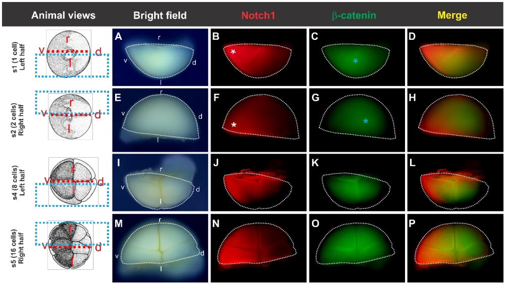 Figure. S1. Distribution of endogenous Notch 1 and β-catenin proteins from s1 through cleavage stages in Xenopus embryos (animal views). Left and right halves of embryos were cut at the indicated Nieuwkoop and Faber stages (s) (left column, turquoise dotted boxes) and processed for whole-mount IF. The embryonic early axes were predicted according to the original pigmentation. (A,E,I,M) Bright field views. (B,F,J,N) Notch1 IF. (C,G,K,O) Total β-catenin IF. (D,H,L,P) Merged images of Notch1 and total β-catenin IF. We noted that in some early embryos, the highest levels of total β-catenin IF located relatively more dorsally (light blue asterisks) than the region were the highest levels of Notch1 IF were found (white asterisks) (see Table S2). d, dorsal; v, ventral; l, left; r, right. |