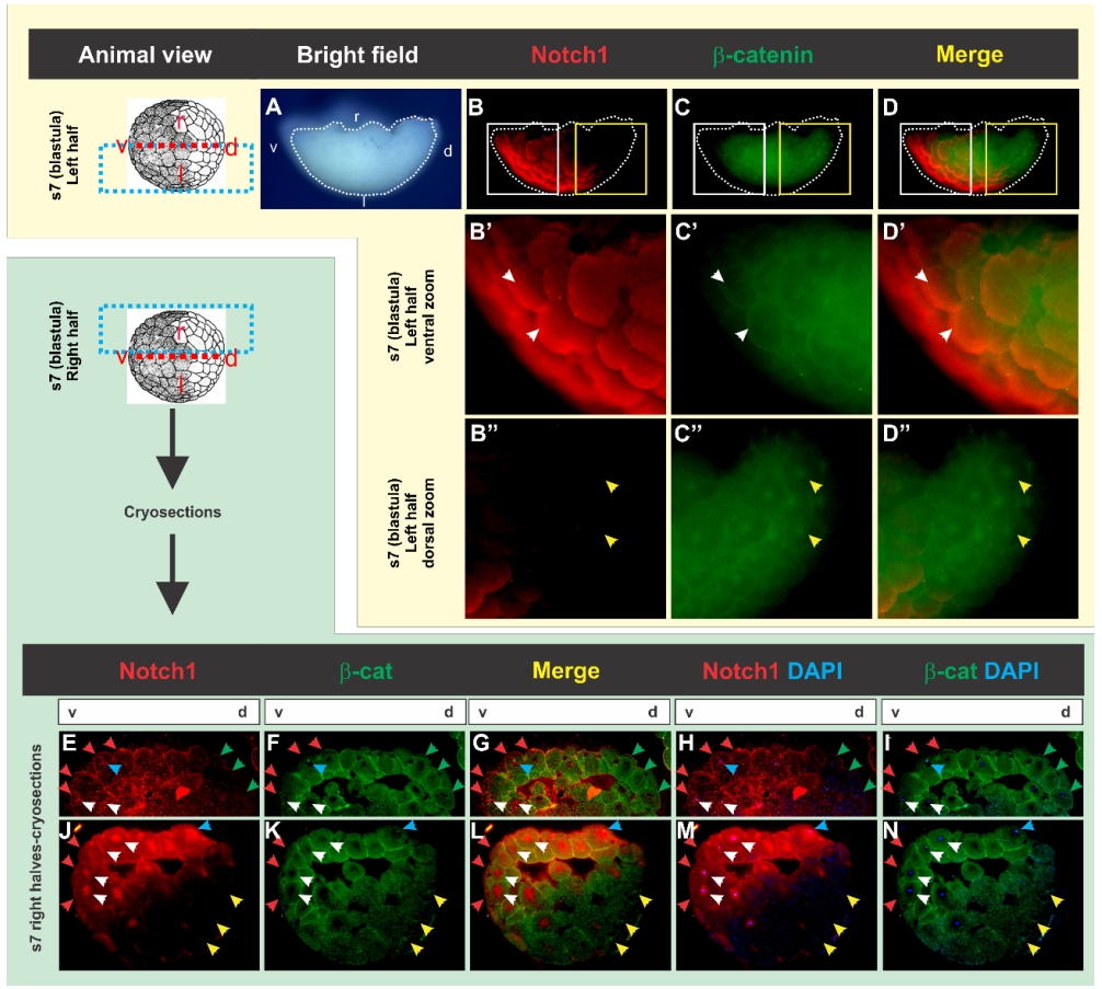 Figure. S3. Distribution of endogenous Notch 1 and β-catenin proteins at s7 in Xenopus embryos. Left and right halves of embryos were cut at the indicated Nieuwkoop and Faber stages (s) (left column, turquoise dotted boxes) and processed for whole-mount IF (A-Dââ) or for IF in cryosections (E-N). The embryonic early axes were predicted according to the original pigmentation. (A) Bright field view. (B-Bââ,E,J) Notch1 IF. (C-Cââ,F,K) Total β-catenin IF. (D-Dââ,G,L), merged images of Notch1 and total βcatenin IF. (Bâ-Dâ) Higher magnifications of the ventral region depicted by the white boxes in B-D. (Bââ-Dââ) Higher magnifications of the dorsal region depicted by the yellow boxes in B-D. Cells in the ventral-most side, with the highest Notch1 IF (white arrows, B',Dâ) stained weaker for nuclear β-catenin (white arrows, C') in comparison with cells of the dorsal side (yellow arrows, Cââ,Dââ), which have the lowest Notch1 IF (yellow arrows, Bââ). (E, J) According to the DV orientation assigned by pigment distribution, Notch1 was significantly enriched in the ventral region in cryosections (8/9 embryos, P<0.0001; Mann-Whitney test; table S1). The pattern of total β-catenin is complex (F,G,I,K,L,N), with membrane-associated and cytoplasmic pools and some immunopositive nuclei (yellow arrows) that begin to be detected at this stage. We found embryos with a significant dorsal enrichment of total β-catenin (F) (4/9 embryos) and others with more ventral staining (K), according to pigment distribution (P<0.0001; Mann-Whitney test; see Table S1), although nuclear β-catenin begins to be detected in some dorsal nuclei (yellow arrows). One of the 9 embryos at s7 (Table S1) showed dorsal Notch1 enrichment and ventral total β-catenin enrichment, and this might be due to the inaccurate DV orientation assigned by pigment distribution; thus, this would render another embryo with ventral Notch1 and dorsal β-catenin. Notch1 is detected in ventral nuclei, which do not show strong nuclear β-catenin staining (white arrows), although some nuclei stain for both proteins (turquoise arrows). Note the lower total β-catenin IF in the apical region of the ventral-most cells, which shows instead high Notch1 IF (red arrows), consistent with the pattern in the whole-mount views, whereas in the embryo with dorsal β-catenin enrichment in E-I, there is higher β-catenin IF in the apical region of the dorsal cells (green arrows). d, dorsal; v, ventral; l, left; r, right. |