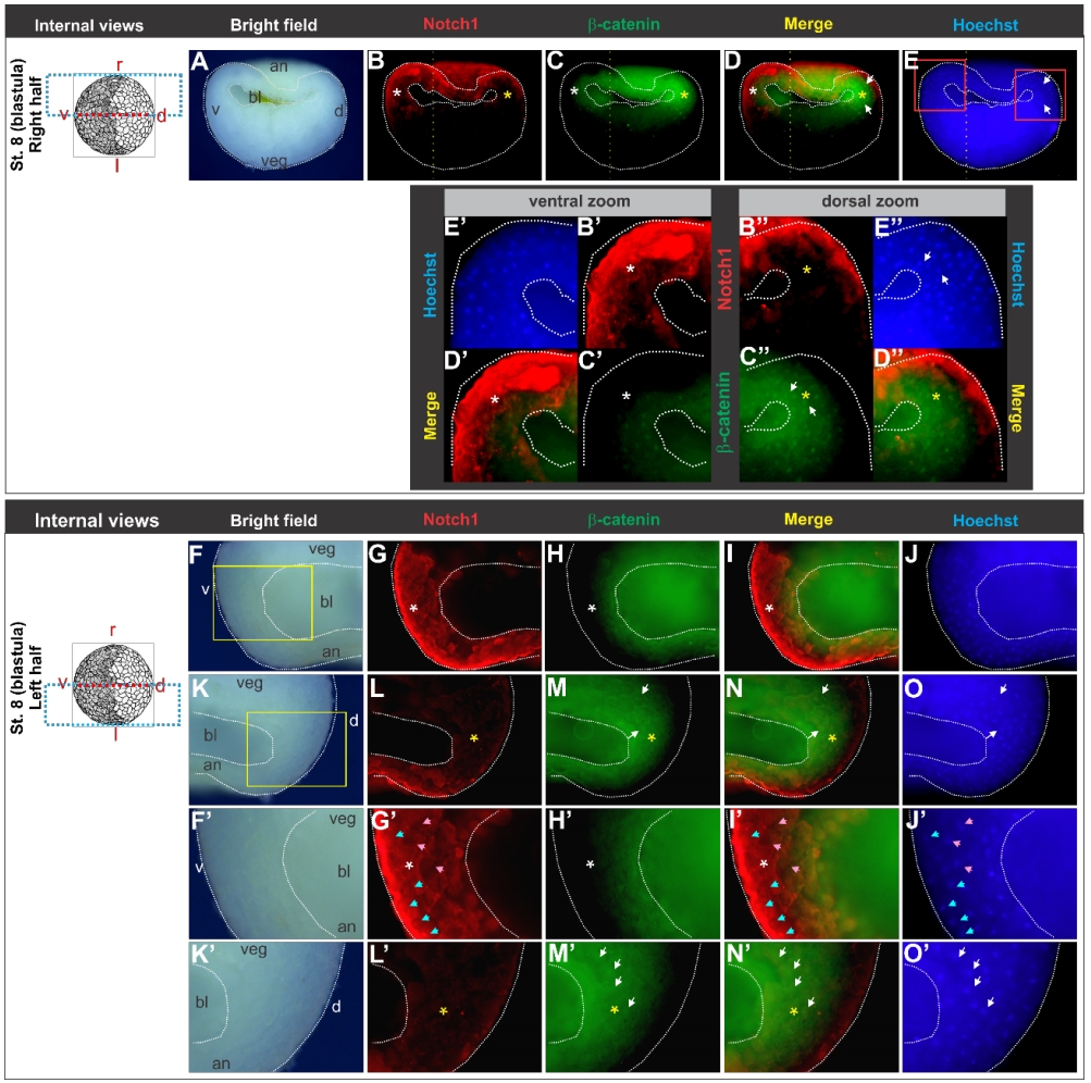 Figure. S4. Distribution of endogenous Notch 1 and β-catenin proteins in Xenopus mid blastula (internal views). Internal views of right (A-Dââ) and left (F-O´) halves of embryos that were cut at s8 (as shown in the left column, turquoise dotted boxes) and processed for whole-mount IF. The embryonic early axes were predicted according to the original pigmentation. (A,F,Fâ,K,Kâ) Bright field views. (B-B'',G,Gâ,L,Lâ) Notch1 IF. (C-C'',H,Hâ,M,Mâ) Total β-catenin IF. (D-D'',I,Iâ,N,Nâ) Merged images of Notch1 and total β-catenin IF. (E-E'',J,Jâ,O,Oâ) Nuclear Hoechst staining. The vertical yellow dotted lines in (B-E) indicate the photocomposition of images taken at two slightly different focal planes to keep nuclei in focus in the dorsal and ventral region of the embryo. (B'-E') Higher magnification of the ventral region of the images shown in B-E, corresponding to the area indicated by the left red box in E. (B''-E'') Higher magnification of the dorsal region of the images shown in B-E, corresponding to the area indicated by the right red box in E. (F-J) and (K-O) Ventral and dorsal regions, respectively, of the same embryo. (Fâ-Jâ) and (Kâ-Oâ) Higher magnifications of F-J and K-O, respectively, corresponding to the yellow boxed area in F and K. Notch1 protein is more enriched in the ventral (white asterisks) than in the dorsal region (yellow asterisks) whereas the opposite occurs with nuclear β-catenin (white arrows). These patterns were consistently found both in right and left halves at this stage in embryos from different batches (94%, n=18, 3 batches of embryos; see Table S2). Interestingly, amongst the ventral cells, we could distinguish Notch1+ nuclei in several cells (Gâ,Iâ,Jâ, light blue arrows) while others did not appear to have nuclear Notch1 accumulation (Gâ,Iâ,Jâ, pink arrows). Bl, blastocoel cavity; d, dorsal; v, ventral; l, left; r, right; an, animal; veg, vegetal. |
