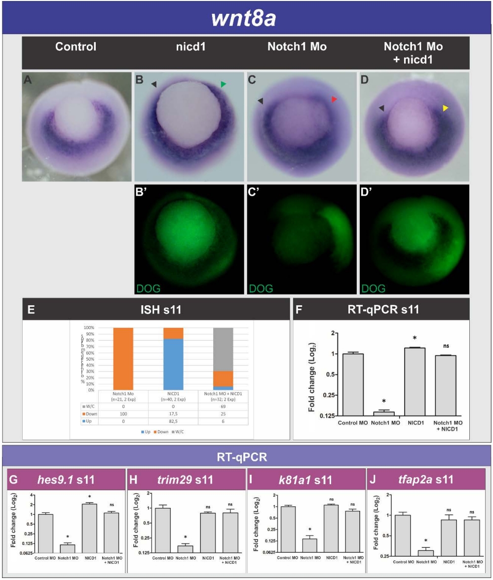 Fig. 4. Notch1 is necessary for the expression of the ventral center gene wnt8a. (A-J) ISH expression pattern of wnt8a mRNA in embryos in which the Notch pathway was stimulated (B,D,F), or blocked (H,J), and in their corresponding sibling uninjected controls (A,C,E,I) or control Mo-injected sibling (G). Insets show the green fluorescence of the co-injected tracer DOG. (B,D) Embryos injected with 1â ng of nicd1 mRNA when the first cleavage was incipient. Note the upregulation and the dorsalwards expansion of wnt8a expression on the injected side in the dorsal view (B), whereas in the ventral view (D), where the tracer is more evenly distributed between the left and the right side of the embryo, wnt8a is strongly upregulated in comparison with the uninjected sibling control (C). (F) Embryo injected with 1â ng of notch1 FL mRNA at the one-cell stage. The expression of wnt8a was consistently stronger than in uninjected sibling controls (E). (G,H) Sibling embryos unilaterally injected with 40â ng of control Mo (G) or with 40â ng of Notch1 Mo (H) when the first cleavage was incipient. Note the downregulation of wnt8a towards the injected side in H. Wnt8a expression in control Mo-injected siblings was essentially unaffected. (J) Embryo injected with 2â ng of su(H)1DBM mRNA at the one-cell stage. The expression of wnt8a was consistently weaker than in uninjected sibling controls (I). (K) Summary of ISH results, expressed as the percentage of embryos showing the changes in wnt8a expression, indicated by the color codes [cyan, upregulated; orange, downregulated; gray, without changes (W/C)]. The number of total embryos analyzed (n) and the number of independent experiments (Exp) are indicated for each bar. (L) Quantification of wnt8a mRNA by RT-qPCR at s10 and at s11. Data are mean+s.e.m. *P<0.05 (one-way ANOVA analysis compared with control Mo injection). s, stage. |