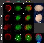 Figure S2. Distribution of endogenous Notch 1 and β-catenin proteins from s1 through cleavage stages in Xenopus embryos (internal views). Left and right halves of embryos that were cut at the indicated Nieuwkoop and Faber stages (s) (left column, turquoise dotted boxes) and processed for whole-mount IF. The embryonic early axes were predicted according to the original pigmentation. (A,E,I,M) Bright field views. (B,F,J,N) Notch1 IF. (C,G,K,O) Total β-catenin IF. (D,H,L,P) Merged images of Notch1 and total β-catenin IF. We noted that in some whole-mount halves from early embryos, total β-catenin IF appeared to have a dorsal bias (light blue arrows) or its highest levels were apparently in a different place (light blue asterisk) in relation to the region were the strongest Notch1 IF was found (white asterisks) (See Table S2). d, dorsal; v, ventral; l, left; r, right; an, animal; veg, vegetal. |
