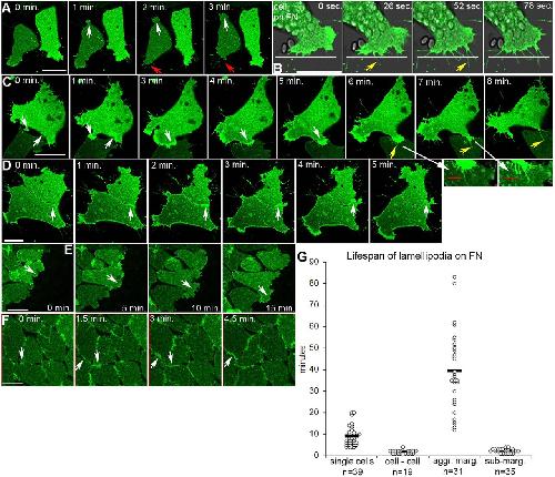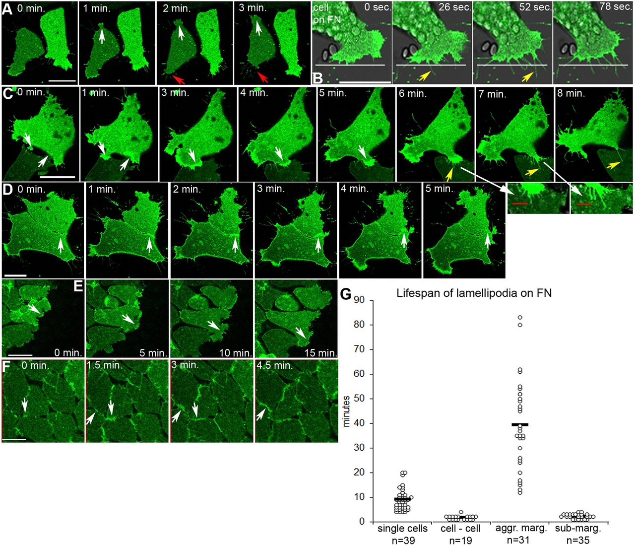 LEM cell aggregation inhibits lamellipodia formation on FN. (A,B) Isolated LEM cells. White arrows show advancing lamellipodia and red arrows show retracting lamellipodia in all panels. (C) Underlapping of LEM cells. Yellow arrows indicate filopodia emanating from a retracting lamellipodium. Long white arrows point to the magnified view, and red lines show the position of the most advanced filopodium at 7 min. (D) Two LEM cells form small, short-lived lamellipodia at the contact site. (E) LEM aggregate with large lamellipodia at the margin. (F) A LEM aggregate forming a few, small, short-lived protrusions submarginally. All cells are labeled with membrane-GFP. (G) Lifespan of lamellipodia; black bars indicate the mean values. Scale bars: 30 µm. |