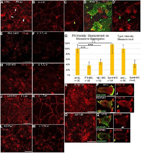 Characterization of csFN on LEM cells. (A-M) LEM aggregates stained with antibody against Xenopus FN. (A-C) Immunofluorescence images show small csFN puncta and clusters of puncta (white arrows) on the free cell surfaces (A) and puncta between cells within the aggregate (B). (C) Yellow arrow points to free cell surfaces at interstitial gap in an aggregate, with csFN puncta on each surface. (D,Dâ²) Lamellipodia (membrane-GFP) (green arrows) cover several csFN puncta (red). (E,F) Knockdown of FN by FN1,2-MO reduces FN puncta on the surface of the aggregate (E) and between cells (F). (G) Intensity of csFN antibody staining was measured on the cell surfaces of the aggregates, using Leica LAS AF Lite software. The average fluorescence intensity of csFN of uninjected aggregates was set to 100%. (H-K) csFN staining after integrin β1 knockdown (H,I) or syndecan 4 knockdown (J,K) on the LEM surface (H,J) or between cells (I,K). (L,M) csFN staining of KD-Pak1-expressing cells on the LEM surface (L) or between cells (M). (N,O) Immunofluorescence staining of LEM explant surface with antibody against integrin β1 (N) or syndecan 4 (O). (P,Q) Double staining with fluorescent phalloidin and integrin β1 (P) or syndecan 4 (Q) antibodies in KD-Pak1-expressing or -nonexpressing cells. Scale bars: 30â