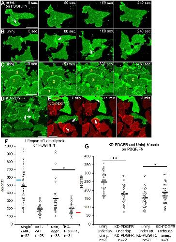 PDGF signaling promotes submarginal protrusion formation in LEM aggregates. (A-E) Frames from time-lapse recordings of membrane-GFP-labeled LEM cells on PDGF-FN. (A,B) Single cells, white arrows show lamellipodia. (C) Serial underlapping of lamellipodia (yellow numbers) in LEM aggregate. (D) KD-PDGFR-expressing aggregates exhibiting small, nonaligned lamellipodia (white arrows). (E) Mosaic of control (membrane-RFP, red) and KD-PDGFR-expressing cells (membrane-GFP, green). White arrows indicate underlapping lamellipodia. (F,G) Lifespan of lamellipodia on PDGF-FN. Black bars indicate mean values, blue bar indicates mean for single cells on FN, red bar indicates mean for aggregates on FN. Significance: *P<0.05, ***P<0.0001. Scale bars: 30â