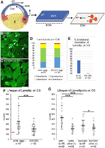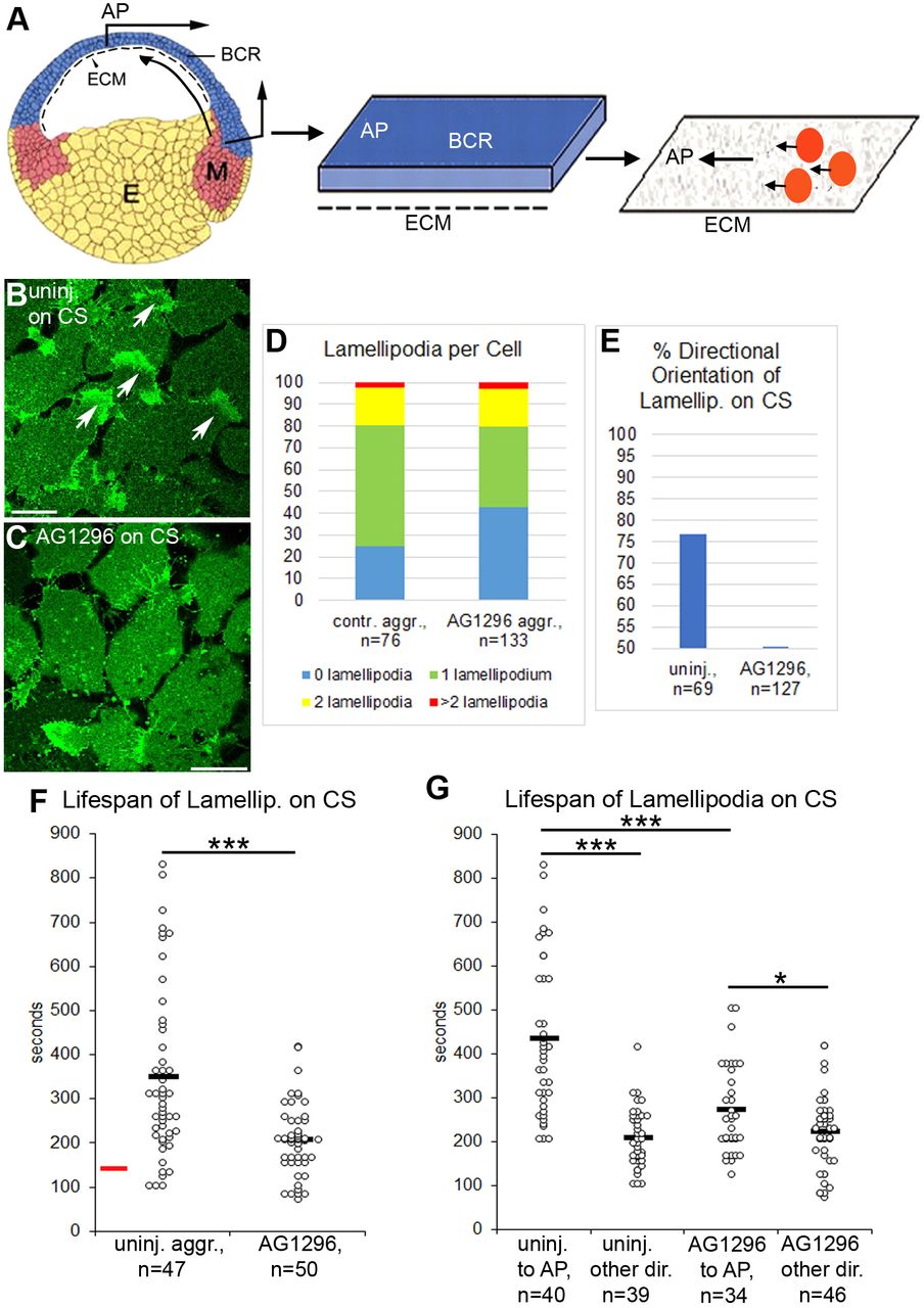PDGF-A signaling controls protrusive activity on the endogenous FN matrix substratum. (A) Schematic of substratum conditioning. BCR is placed on the glass bottom of the dish to transfer its ECM. LEM explants (orange) migrate directionally towards the animal pole position (AP). E, endoderm; M, mesoderm. Curved arrow, movement of LEM in embryo. (B,C) Membrane-GFP-labeled LEM aggregates on conditioned substratum without (B) or with PDGFR inhibitor AG1296 (C). Arrows indicate lamelliform protrusions oriented towards animal pole (top right). (D-F) Lamellipodia per cell (D), fraction of lamellipodia orientated towards animal pole (E), and lifespan of lamellipodia (F) on conditioned substratum in untreated or AG1296-treated aggregates. Red bar in F indicates average lifespan on FN. (G) Lifespan of lamellipodia pointing animally (to AP; above line perpendicular to animal-vegetal axis) or in other directions (other dir.; along or below this line) in untreated or AG1296-treated LEM aggregates on conditioned substratum. Statistical significance: *P<0.05, ***P<0.0001. |