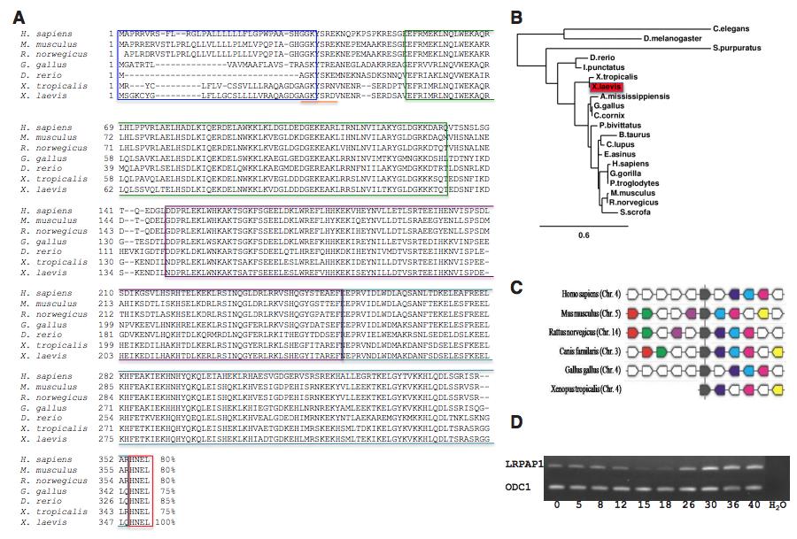 Fig. 1. Identification of xl-lrpap1 as a true lrpap1 ortholog. (A) Comparison oft the deduced LRPAP1 amino acid sequences from Xenopus laevis