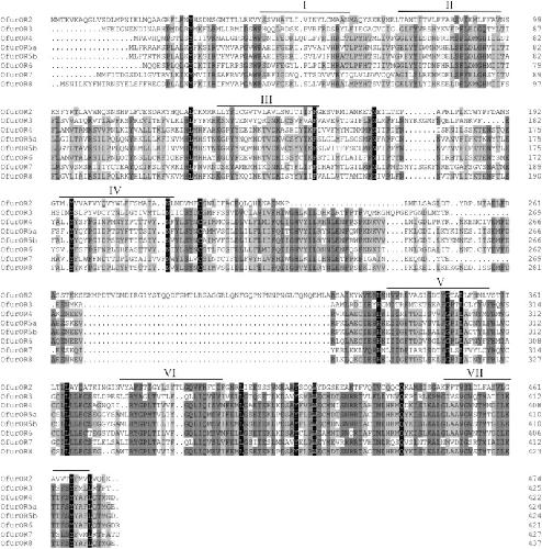 FIGURE 1. Alignments of amino acid sequence of odorant receptor co-receptor and pheromone receptors in O. furnacalis. Transmembrane domains were predicted by TMHMM Server Version 2.0 (http://www.cbs.dtu.dk/services/TMHMM/) and multiple alignments and identity calculation were done by the DNAMAN 6.0 (Lynnon Biosoft, United States). Predicted seven-transmembrane domains are marked with roman numbers. Amino acid numbering is given on the right of the alignment. Gaps in the alignment are indicated by a dash.