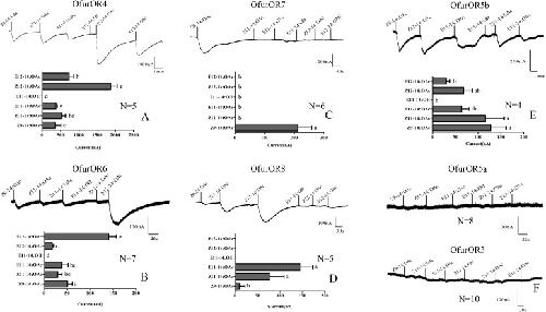 FIGURE 2. Representative current traces of OfurORn in response to pheromone components using Xenopus oocyte system. All the receptors were co-expressed with OfurOR2. Pheromone components (100 μM) were applied for 15 s at the time indicated by black line. Bar graph showed the statistical differences in response to each pheromone components (Mean ± SEM). (A) OfurOR4; (B) OfurOR6; (C) OfurOR7; (D) OfurOR8; (E) OfurOR5b; (F) OfurOR5a and OfurOR3. Bars labeled with different lowercase letters are significantly different.