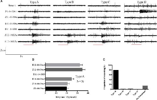 FIGURE 3. Single sensillum recordings of s. trichoidea from male adults in O. furnacalis. (A) Four different types (Type A–D) of s. trichoidea characterized by the response to pheromone components. The stimulus was applied for 300 ms which was represented with a red line under the trace. (B) Type A sensilla in response to pheromone components (10 μg). Data are represented as Mean ± SEM (N = 76). (C) The proportion of different sensilla type recorded in this study.
