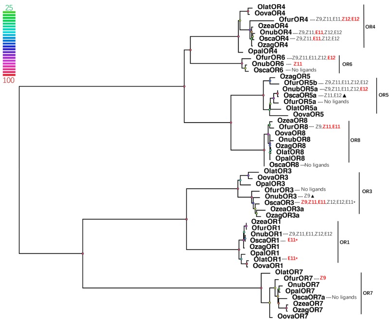 FIGURE 4. Phylogenetic tree of PRs and correspond Ostrinia pheromone ligands. Node color indicates the bootstrap values. (Bold and red letters indicated the components which the receptor mainly responded; Z9 = Z9-14:OAc, Z11 = Z11-14:OAc, E11 = E11-14:OAc, Z12 = Z12-14:OAc, E12 = E12-14:OAc, E11â = E11-14OH; pheromone receptors from O. nubilalis were renamed follow the system in Table 1, OnubOR1 = OnubOR5, OnubOR3 = OnubOR4, OnubOR4 = OnubOR3, OnubOR5a = OnubOR1, The former was the name we use for phylogenetic analysis, the later was the name reported from reference in Table 1; triangles represented the response was very weak).