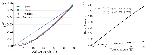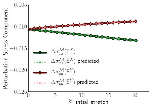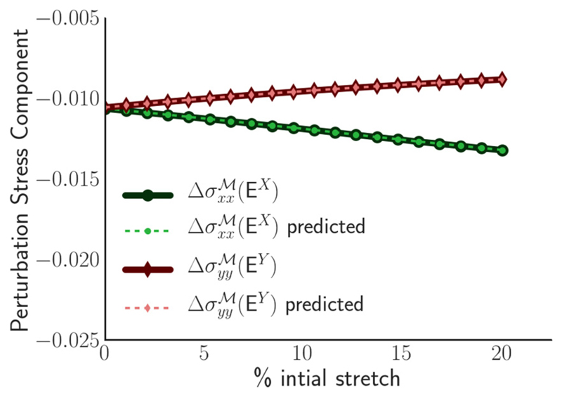 Fig. 5. Perturbation stress response to small-amplitude deformations in a prestretched monolayer. The stretched monolayers used were the same as those for the solid line in Fig. 4(b), with (Λ,Γ) = (−0.259,0.172) and the magnitude of prestretch is indicated on the x axis. The equilibrium prestretched monolayers were subjected to small deformations in the x [EX = diag(λ,0)] and y [Ey = diag(0,λ)] directions, with λ = 0.01. The component of the perturbation stress tensor in the direction of stretch is indicated on the y axis, with Δσxxℳ(EY) giving the x-directed stress following EX (lower line) and Δσyyℳ(EX) giving the y-directed stress following Ey (upper line). Solid lines indicate values directly evaluated using (12) and dashed lines are predicted values using (28).