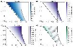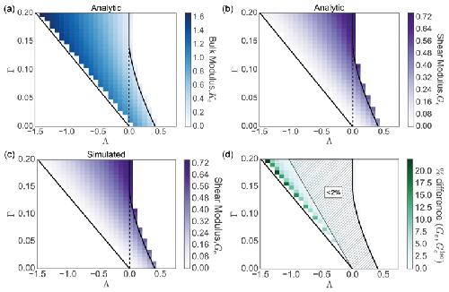 Fig. 6. (a) Heat map across discrete intervals of (Λ,Γ) parameter space showing the value of the analytic bulk elastic modulus Ke [calculated using (33)] of a disordered isotropic monolayer with 800 cells. (b) Equivalent plot of the analytic shear modulus [calculated using (37)]. (c) Computationally estimated shear modulus across parameter space. The elastic shear modulus Ge was estimated from the global perturbation stress as Δσxyℳ=−κGe, following a 1% simple-shear deformation (k = 0.01) on the simulated monolayers used in (b). Each data point is taken as an average from five realizations of a monolayer with 800 cells, with Pext = 0. (d) Percentage difference (|Ge−Geiso|/[0.5(Ge+Geiso)]) between the exact modulus Ge (37) and the approximation Geiso (38), across parameter space; the difference is below 2% in the hatched region.