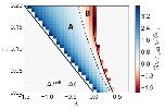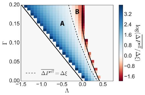 Fig. 7. Heat map across discrete intervals of (Λ,Γ) parameter space showing the value of log(ΔPeff¯/ξ^). The dashed line represents the contour where ΔPeff¯=ξ^: Tissues show dominant resistance to area change in the shaded region to the left of the dashed line [where log(ΔPeff¯/Δξ)>0, region A], and to shear in the region to the right [where log(ΔPeff¯/Δξ)<0, region B]. A log scale is used to help display the differences across a large range of values. The monolayers used for all heat maps were the same as those used in Fig. 6, where each data point is taken as an average from five realizations of a monolayer with 800 cells, with Peff¯=0.