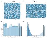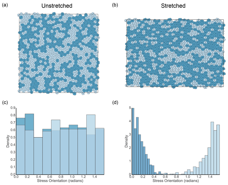 Fig. 3. (a) A simulation of a representative monolayer realization satisfying Peff¯ = 0 with 800 cells, for (Λ,Γ) = (−0.259,0.172) (see Fig. 1 for the location in parameter space). Cell shadings and line segments follow the scheme in Fig. 2. (b) The monolayer in (a) following a 20% area-preserving uniaxial stretch and subsequent relaxation. (c), (d) Histograms showing the orientation of the principal axis of stress for cells under tension (darker) and compression (lighter), for monolayers given in (a) [corresponding to (c)] and (b) [corresponding to (d)]. Bin size was selected using the Freedman-Diaconis rule.
