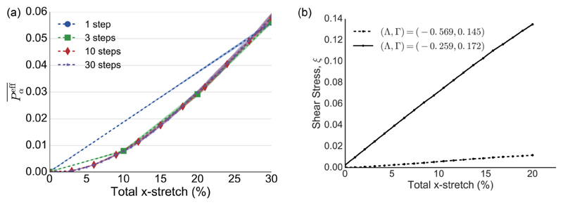 Fig. 4. (a) The effect of incremental stretch on effective tissue pressure. The tissue shown in Fig. 3(a) was subjected to a 30% area-preserving uniaxial stretch in a varying number of steps (straight lines are drawn between data points). The total stretch was divided into equally spaced increments and the tissue was relaxed after every stretch. The tissue starts at Peff¯ = 0 and ends at approximately Peff¯ = 0.57, regardless of how many steps were used. Translucent shading indicates 95% confidence intervals over the five simulations. (b) Shear stress ξ vs magnitude of stretch with (Λ,Γ) = (−0.259,0.172) (solid; the monolayer given in Fig. 3) and (Λ,Γ) = (−0.569,0.145) (dashed). See Fig. 1(b) for locations in parameter space. Each data point represents an instantaneous stretch performed on the same initial isotropic monolayer satisfying Pext = 0. The monolayers were relaxed to equilibrium following stretch.