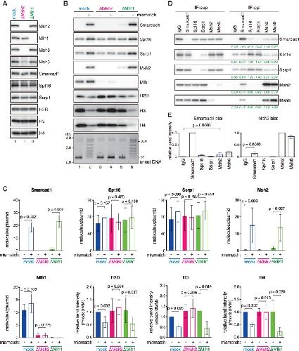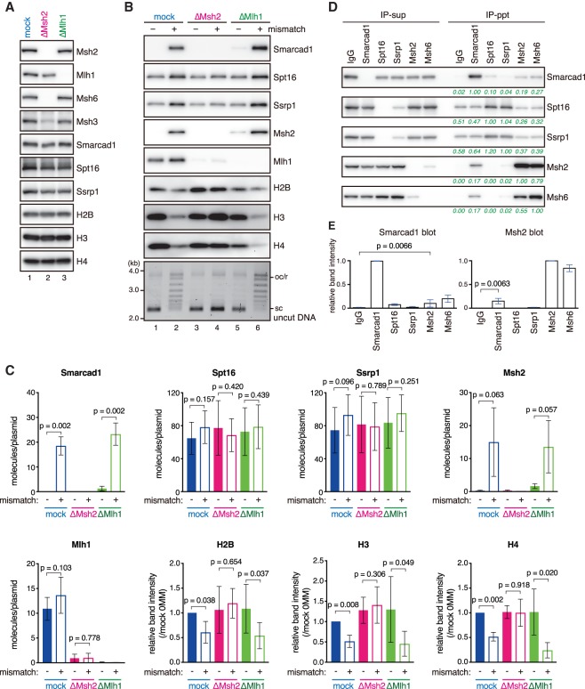 Figure 4. Smarcad1 is recruited onto mismatch-carrying DNA in a Msh2-dependent manner. (A) The immunodepletion efficiencies of Msh2 or Mlh1. NPE was depleted using preimmune antibodies (lane 1, mock), a mixture of Msh2 and Msh6 antibodies (lane 2, ΔMsh2), or Mlh1 antibodies (lane 3, ΔMlh1). NPE (0.25 µL) was separated by SDS-PAGE and probed with the indicated antibodies. The depletion efficiencies for Msh2 and Mlh1 were estimated as 99% and 98%, respectively. (B) Immobilized pMM1homo (lanes 1,3,5) or pMM1AC (lanes 2,4,6) was incubated in NPE as described in A and recovered. Immunoblotting of the indicated antibodies and uncut DNA stained with SYBR Gold is presented. (C) Quantification of chromatin-binding factors. Band intensities were normalized to the amount of DNA quantified by qPCR. For Smarcad1, Msh2, Mlh1, Spt16, and Ssrp1, the number of molecules on a plasmid was estimated by using recombinant proteins as standards. Histones were normalized to the amount on no mismatch DNA in the mock sample. Mean ± one SD is shown. n = 4. P-values were calculated by the paired t-test (two-tailed). (D) Coimmunoprecipitation of Smarcad1 and MutSα. Immunoblotting of supernatant (IP-sup) and bead (IP-ppt) samples is presented. Green numbers represent band intensities relative to the target protein of immunoprecipitation. (E) Quantification of immunoprecipitated proteins. Mean ± one SD is shown. n = 3. P-values were calculated by the paired t-test (two-tailed).