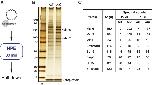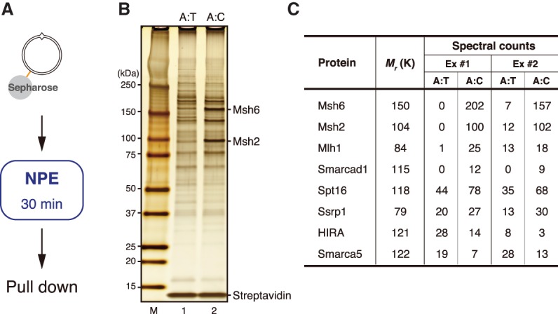 Figure 3. Identification of factors that are recruited onto mismatch-carrying DNA. (A) Schematic diagram of the plasmid pull-down assay. (B) Silver staining of mismatch DNA-binding factors. Samples were separated by SDS-PAGE and stained with silver nitrate. (A:T) pMM1homo; (A:C) pMM1AC. “M” indicates size markers. (C) Summary of mass spectrometry analysis. Spectral counts of the indicated proteins are listed along with their molecular masses. (Ex #1 and Ex #2) Independent experiments. See also Supplemental Table S1 for the complete list of identified factors.