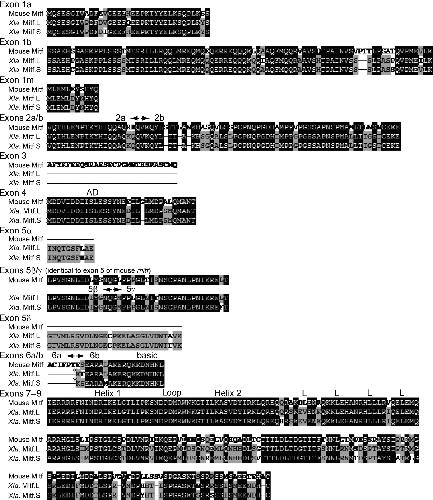 Figure 2. Amino acid sequences of Mitf in X. laevis and mouse. The activation domain (AD), basic region, helix–loop–helix domain, and leucine (L) zipper domain are shown. Identical residues and conserved residues are shaded black and gray, respectively. Arrows indicate the boundaries of exons 2a/b, 5β/γ, and 6a/b. Exons 3 and 6a are specific to mouse mitf, whereas exons 5α and 5δ are specific to X. laevis mitf. The continuous exons 5β/γ of X. laevis mitf are identical to exon 5 of mouse mitf. When Mitf transcript variants are produced by skipping exon 5δ, the amino acid changes from Lys (K) to Glu (E) in the beginning of exon 6b (asterisks) in both Mitf.L and Mitf.S (see Figure for details). Accession numbers: mouse A‐Mitf, NM_001113198.1; mouse M‐Mitf, NM_008601.3; X. laevis Mitf, LC315567‐LC315583 (DDBJ).